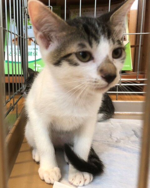 | 特徴(性格など) | 人懐こい仔で、健康です。 眉毛模様があるのが特徴。 4頭同時に保護されたうちの1頭です。 エイズ・白血病 陰性 |