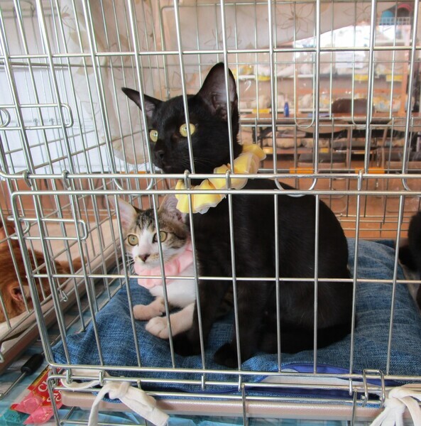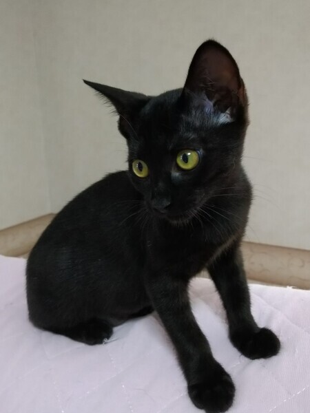 | 特徴(性格など) | 2022.6.4生まれ(推定) 毛色:黒 細長いしっぽの黒猫の女のコ。 好奇心旺盛でニャンプロやボールを転がして遊んだりします。 人懐っこい性格で、まん丸お目々で見つめてきたり、 喉をゴロゴロならしながら近づいてきます。 座っているとカラダを登ってきて顔をペロペロしてくれます。 みんなでご飯を食べていると他のコのご飯が気になってキョロキョロします。 |