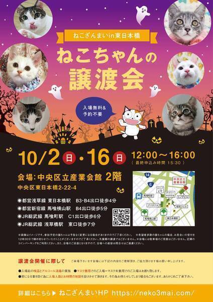 | その他(譲渡条件など) | 11:30より、2階会場入口にて受付を開始します。 受付時に入場予定時間が記入された整理券をお配り致しますので、整理券を受け取った方はお時間になりましたら2階会場入口に番号順にお並び下さい。 ※11:30より早くいらしてもお待ちいただく場所がございません。 また、近隣にお住まいの方や他階フロアのご利用者様にご迷惑となる場合がございますので、受付開始時間にあわせてお越しくださいますよう、何卒ご協力お願いいたします。 ※ねこざんまい譲渡会は、先着順で里親様を決定する譲渡会ではありません。 先に申し込みをした方を優先することもありません。 お話をして、その猫ちゃんに合ったおうちに決めさせていただいております。 12時に開場し、里親様の決定は14時以降となります。 14時以降にご入場の場合、希望の猫ちゃんが決定している可能性があります。 また1頭に対し多数のご希望をいただいた場合、早めに申し込みを締め切らせていただく場合がございますので、予めご了承下さい。 里親様決定は14時以降となります。 その後、迎え入れ準備の説明等のお時間も頂戴しますので、お時間に余裕を持ってご来場下さい。 【新型コロナウィルス感染予防対策について】 譲渡会開催に際し、ご来場下さいます皆様には以下の内容をご理解頂き、ご協力頂けます様お願い申し上げます。 ●入場前の検温とアルコール消毒の実施 ●マスク着用でのご入場=マスク未着用でのご入場はお断り致します ●入場人数の制限をさせていただきます(来場多数の場合は入れ替え制となります) ●時間と人数の制限=密になる事を防ぐ為に入場人数とお時間の制限を設けさせて頂きます その為お待たせしてしまう場合もございます ●会場利用規約により、ご来場者様の連絡先を控えさせていただきます あらかじめご了承下さい。 諸々の制限がございますが、安心・安全な譲渡会運営のためにご理解・ご協力いただきますようお願い申し上げます。 ~~~~~~~~~~~~~~~~~~~~~~~~~~~~~~ ★仔猫ご希望の里親様★ 仔猫ちゃんたちは、まだ体がしっかりしていない赤ちゃんです。 下痢だけでも数時間対応ができなかっただけ死に至る事もあります。 その為、月齢に応じたお留守番時間を設けさせていただいております。 また、子猫ちゃん(6ヶ月未満)の里親様には子猫支援金のご協力をお願い致しております。 ★猫ちゃんとのお見合いは譲渡会で!★ ねこざんまいの猫ちゃんは譲渡会でのお見合いのみとなります。 『この子はいつ譲渡会に参加するの?』『譲渡会場の場所はどこ?』などは、ねこざんまいホームページをご覧ください。 https://neko3mai.com/ ★楽しく猫ちゃんと触れ合って★ ねこざんまい譲渡会は、猫ちゃんも里親様も保護主も笑顔で過ごせる譲渡会を目指しています。 これから20年以上、楽しい時も、悲しい時もいつも傍にいてくれる大切な家族になる猫ちゃんです。 会場には沢山の猫ちゃんがいます。 1匹1匹、触れ合って猫ちゃんとお話してください。 『初めて猫ちゃんを家族に迎える方』 『先住猫ちゃんのお友達を迎える方』など トライアルの仕方や先住猫ちゃんと仲良くなるコツなど経験豊富な保護主やスタッフにお気軽にご相談ください! 猫を愛し、そして猫に愛されている猫好きスタッフと保護主がアドバイスさせていただきます。 ★里親希望のみなさまへ★ ペットではなく、家族一員としてたっぷり愛情を注いでくださるご家庭をお待ちしております。 恐れ入りますが ●学生の方、子猫・幼猫希望の60才以上の方のみのご家庭 ●脱走防止対策にご協力いただけない方 は原則譲渡を遠慮させていただいております。 ●一人暮らし・同棲(事実婚)の方 保護主の希望や猫の年齢・性格等により、ご希望に添えない場合もございます。 参加猫ちゃんは、それぞれ保護主(実際に猫ちゃんを自宅に入れ、保護をしている方)が異なります。 詳しい条件なども異なる場合がございますので、会場内で直接保護主とお話ください。 〖共通条件〗 1.終生飼育 2.完全室内飼い 3.脱走防止対策へのご協力 4.避妊去勢手術 5.契約書類へのサイン 6.定期報告 7.医療費等の負担 当日の猫ちゃんを連れて帰ることはできません。後日、保護主が里親様のご自宅までお届け致します。 その為、移動の際の猫ちゃんの負担を月齢などから考慮し、お届け地区を限定させて頂くこともございますのでご了承ください。 ご理解とご協力のほど宜しくお願い致します。 ☆よくある質問☆ ・譲渡の条件 ・ご負担頂く費用 ・譲渡会の場所等は ホームページに詳しく掲載させて頂いておりますのでご覧ください。 https://neko3mai.com/ メールでのお問い合わせはすぐにご返答出来ない場合がございますのでご了承ください。 ホームページ https://neko3mai.com/ お問い合わせ http://www.neko3mai.com/contact/form_general.html ねこざんまいブログ http://ameblo.jp/neko3mai/ |
