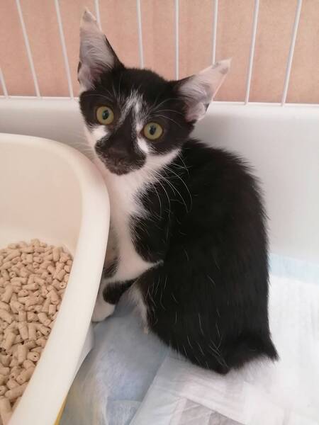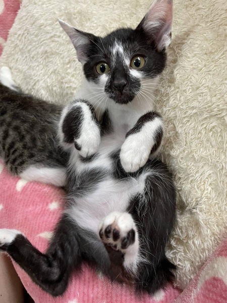 | 特徴(性格など) | ピカソ顔負けのユニークな黒白の男の子、たろくんです。 抱っこ大好きの甘えん坊です。 食べることより遊びがいい~✴️ 優しい一面もある子です。 |