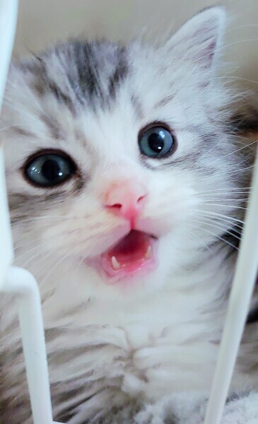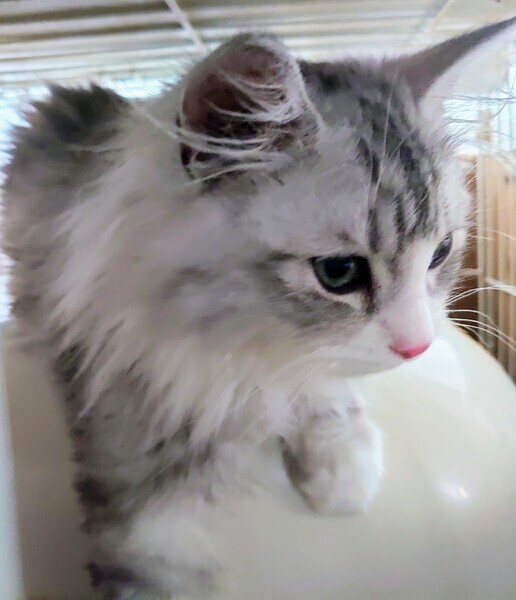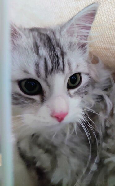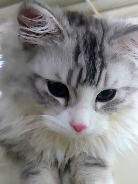 | 特徴(性格など) | 白銀の長毛シルバータビー王子様マーブル。 写真:1枚目から6枚目がこのモフモフ坊や。7枚目がパパ猫ミヌエット。8枚目がミックスのママ猫。 長毛・長足のミヌエット父猫と長毛ミックスのママ猫から生まれた長毛・長足のシルバーポイント・バイカラーのミックス坊やです。 ミヌエットの父猫:毛色はホワイトとクリームのモヘアのような超長毛。瞳は黄色。 ミックスの母猫:青い瞳のブルーポイントバイカラー(ラグドール風)。このミックスの母猫は、ラグドールの父猫(青い瞳のブルーポイントバイカラー)とサイベリアン・ネヴァ・マスカレードの母猫(青い瞳のブルーポイントバイカラー)から生まれました。 マーブルの毛色は銀と白で、銀色の部分は毛先が銀、根元が白。毛は根元から伸びるので、成長するにつれ、全体的に毛が白っぽくなります。まさに大理石(マーブル)か銀雪の王子様。瞳の色は黄色か黄緑(変化する可能性があります) 顔は綺麗な八割れで、鼻筋が白、手足の先も白。 かっこよく言えば、シルバーポイント・バイカラー・リンクス(シルバータビー)。 (=全体的に黒で、鼻筋や手先に白のポイントカラーが入っている縞々の八割れ猫) 美しい子です。 パパ猫ミヌエットがモヘアのような毛(参考:7枚目の写真)で、マーブルも首筋の後ろに毛玉ができやすいです。 マーブルは外見が大型猫サイベリアン・ネヴァ・マスカレードに似ていますし、身体もミヌエットにしたら大きめですが、毛質はミヌエットの父猫に似ている可能性があります。 モヘアの毛は繊細で美しいですが、もつれやすいので、もつれる前に頻繁にブラッシングしてやってください。 一旦もつれたら、ブラッシングを痛がってブラッシングを嫌がるようになります。ブラッシングできなくなって更にもつれてフェルトのように固くなると、ペット用バリカンでも刈れなくなります。この場合、麻酔をかけてハサミでカットすることになりかねません。大人しい猫でも、ハサミでカットすると皮膚を切る可能性がかなり高くて、万が一首の頸動脈などを切ると死ぬからです。 マーブルはとても人懐こい子で、なでてもらったりマッサージしてもらうのが大好きな子です。 多頭飼いで育ったので、猫とも仲がいいです。 多頭飼いでわいわい楽しく育っていますので、猫2匹以上(5匹以下)で飼ってやってください。 ペットではなく家族として飼ってください。 特にサイベリアンは犬的な性格もあり、家族思いで、飼い主が冷たいと早死にするとも言われています。 サイベリアンの血が1/4のこの子でできるかどうかはわかりませんが、サイベリアンにボール遊びを教えれば、犬のようにボールを取って来るそうです。 |