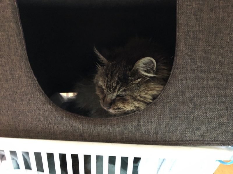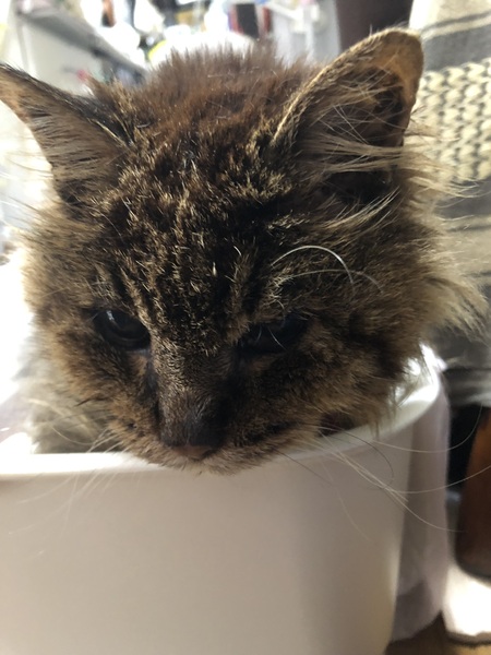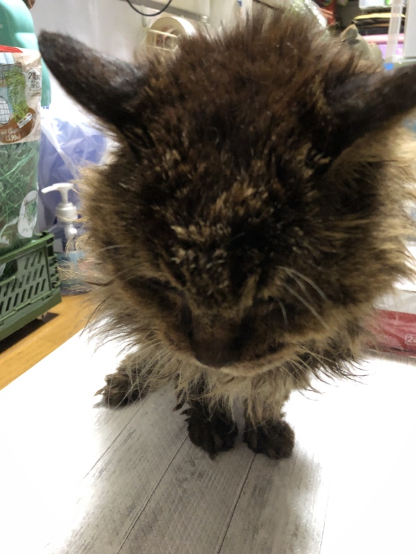 | 特徴(性格など) | 焦茶と茶色。キジトラっぽい長毛種のミックスちゃんです。 性格はとてもフレンドリーで大人しいです。 長時間撫で続けても噛んだり猫パンチしたり引っ掻いたりしません。 お腹が空いていると大きな声で話しかけてきます。 人が複数人で話していると真ん中に入ってきます。 魚よりお肉が好きみたいです。 写真写りが悪いのか、目つきが鋭い写真ばかりですが、本物はすごく可愛いです。 食欲あります。おしっことうんちもちゃんと出ています。 健康状態については次の「経緯など」も併せてご覧ください。 |