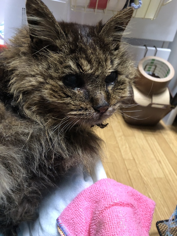 | 里親募集する理由 | 近所で飼われていた猫らしいのですが、そこが引越すと共に猫だけ置いていかれてしまい、長年ほかの近所の方が餌をあげてきたいわゆる地域猫です。 私がこの子を知ったのはここ2年くらいです。 9月25日に、道に倒れているところを地域外の方が発見され、警察に通報、警察に保護されたため、同月28日に私が引き取りに行き、現在自宅で保護しております。 一応、猫は引き取ったその日のうちに病院に連れて行って血液検査して頂き、結果としては長年の野良生活からくる毛玉が酷いことを除けば年齢(推定でも13歳以上?)のわりには酷い数値ではないことが分かりました。 血液検査のみなので肺ですとか、他の血液検査で分かるもの以外は現在まだ分かっていません。 ただ年が年ですので後ろ足が踏ん張れずヨボヨボしています。猫特有の上下運動は殆どしません。 目はあまり見えていないようですが私の部屋をうろうろすることは可能なようです。基本的にはじっとしているか寝ているか、という感じです。 本来ならば引き取ってきた私が最期までお世話すべきですが、恥ずかしながら経済的な面はもとより、住居の面でも自分で最期までお世話してあげることが難しいのが現状です。 (経済的余裕がないのに猫を引き取るなというご批判、理解しています。) どうかこの猫ちゃんに良きご縁をお願い致します。 |