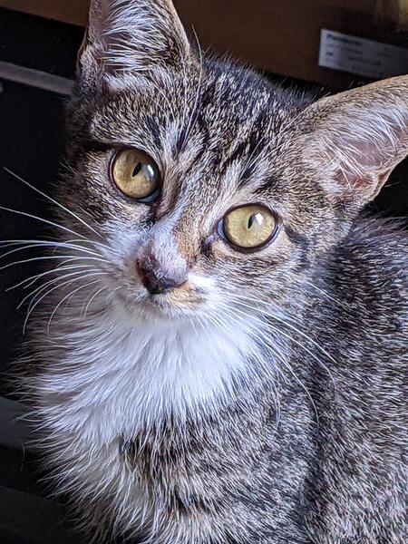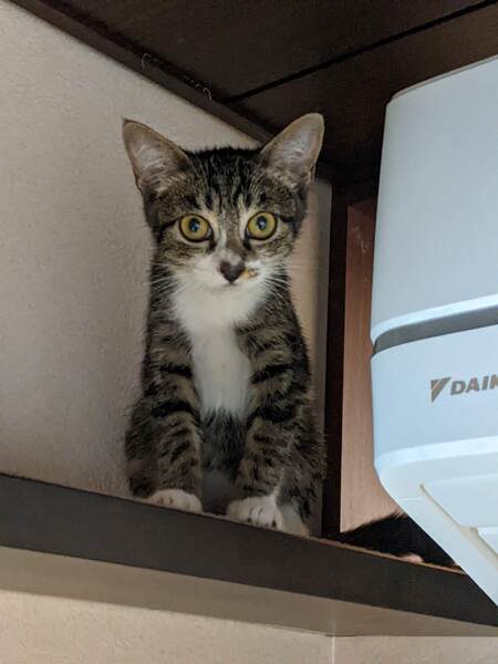| 特徴(性格など) | 前足は白の靴下・後ろ足は白のタイツ・胸は白のエプロンのキジトラの女の子です。 推定生後三か月位、元気いっぱい、好奇心旺盛で、甘えん坊さん。膝の上でナデナデされるのが大好きです。 トイレの躾済。 |