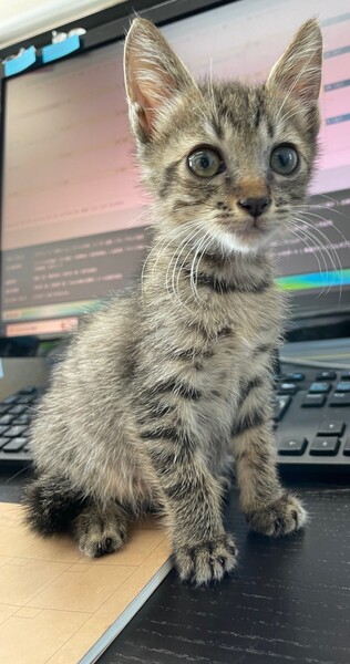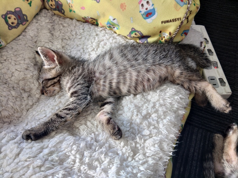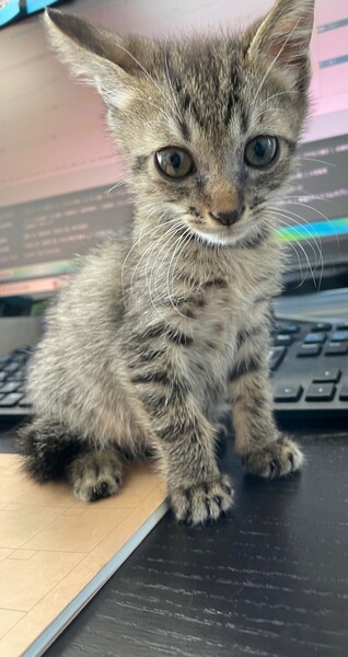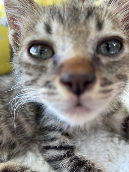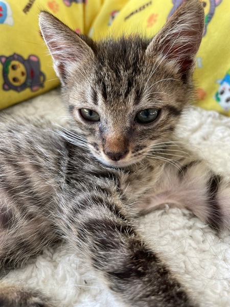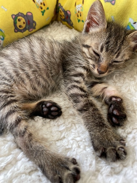 | 特徴(性格など) | キジトラです。 離乳済みで、子猫用のドライフードもよく食べます。 性格はおっとりしていますが、おもちゃを出すと元気よく遊びます。 人馴れもしていて、寄ってきます。 他の猫とお昼寝をしたり遊んだり、仲良く過ごせています。う |
