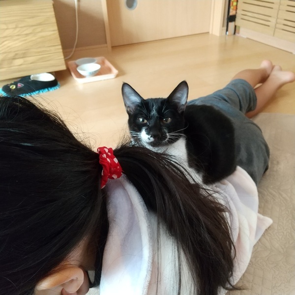 | 特徴(性格など) | 鼻下のホクロがチャームポイントのおとぼけ顔。先輩猫にくっついてまわる甘えん坊。 短い鍵しっぽがかわいい! 短いなりにプリプリ動かして感情豊か♥️ 追いかけっこ、プロレス、かくれんぼと毎日大忙し!疲れると、先輩猫や人間の近くでスヤスヤ~。 検便、ノミダニ虫駆除済、エイズ白血病ウイルス検査(陰性)、3種ワクチン接種2回目済、レボリューション済み、健康状態良好。 |