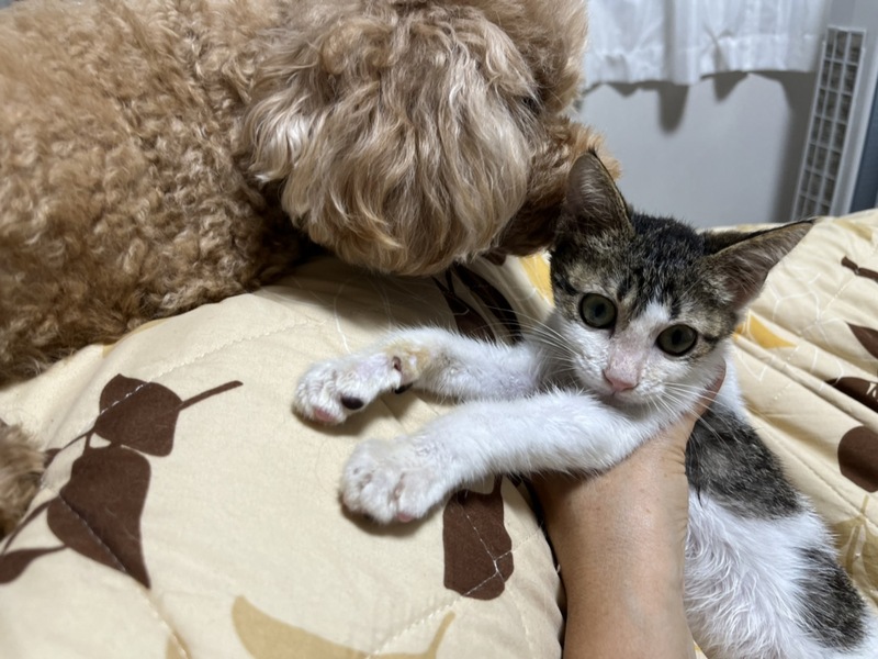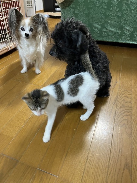 | 特徴(性格など) | とっても甘えん坊、人見知りなし、先住猫や犬にもゴロゴロ喉を鳴らしながら甘えて、スリスリデレデレ、遊んでは甘え、食べては甘え、寝ては甘え、一度抱くと虜になること間違いなし 検便、ノミダニ駆除済み、エイズ、白血病ウイルス検査陰性、3種混合ワクチン1回目接種済 |