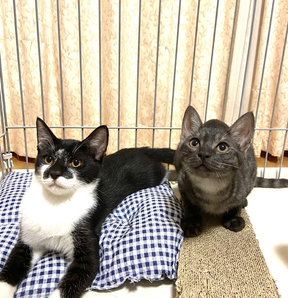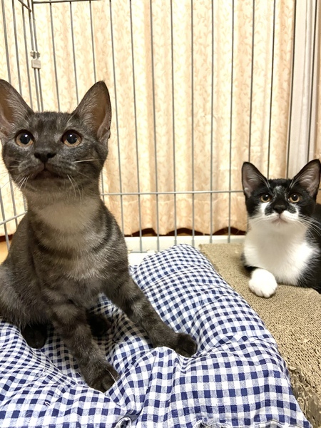 | 特徴(性格など) | マミちゃん、珍しいグレーのシマシマスモークの女の子です。アンダーコートはシルバー。綺麗な色合いの子です。スリスリ甘えん坊で抱っこもできます。 タビちゃん、黒白で鳴き声のかわいい男の子です。 温厚でいつもマミちゃんを守ってる兄貴タイプ。 なのに取っ組み合いはマミちゃんに負けます。 マミちゃんの後ろからしれっと甘えてきて、ペロペロ舐めてくる舐め猫です。甘噛みなし。 食欲旺盛でガッチリした体型の健康優良児です。 |
