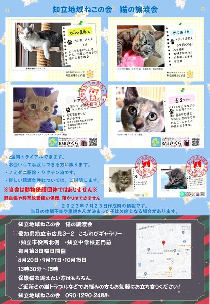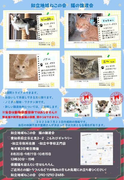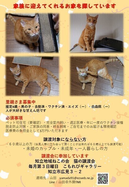 | その他(譲渡条件など) | ・知立地域ねこの会主催の猫譲渡会にてお見合いしていただける方 こもれびギャラリー 知立市広見3-2 毎月第3日曜日開催 8月20日・9月17日 13時30分~15時 《必須事項》 ペット可住宅(要確認)・完全室内飼い・適正医療・年に一度のワクチン接種・脱走防止対策・ご家族の同意・終生飼育・ご自宅までのお届け&環境の確認 ・譲渡費用ですが、ワクチン&去勢手術などの治療費で3万円となります ・譲渡内容についての詳しい説明は譲渡会で行います 譲渡対象にならない方 ・60歳以上の方(後見人様に立ち会って頂くことが出来れば60歳以上でも譲渡可能) ・未婚のカップル・未成年・一人暮らしの方 |