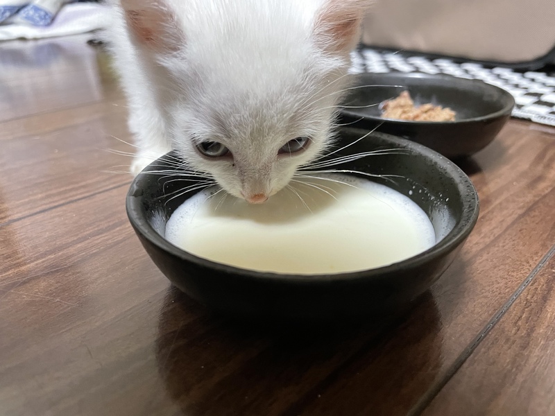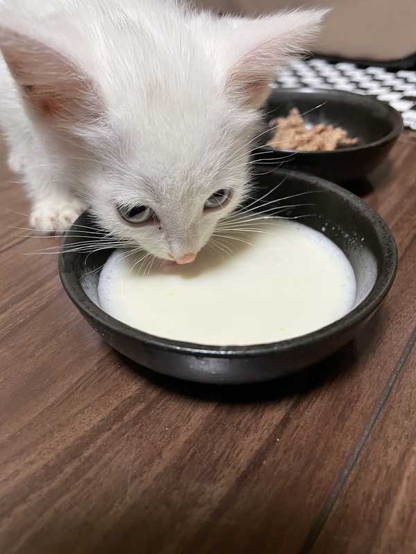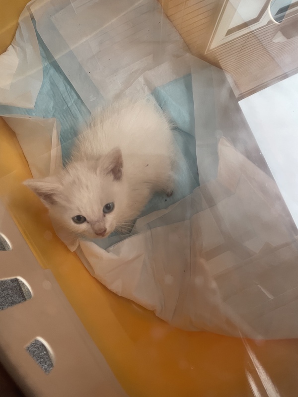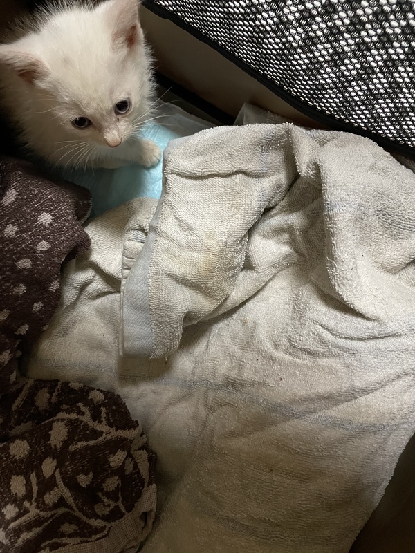 | 特徴(性格など) | 真っ白では無く、頭に黒い毛が点々とあります。尾っぽもやや茶色ような気がします。 オッドアイ。300gと小さいです。 保護日10/7の夕方すぐに医療機関受診し、駆虫薬(ダニ、シラミ?、回虫)を塗ってもらいました。 性別は小さいのと、保護したままだったので汚れていて獣医さんも判断出来ませんでした。おそらく男の子かなと、、、 先住猫が居るので隔離中のためまだ性格はさほどわかりません。人に対しては怖がる事なく、撫でるとゴロゴロ喉をならしてます。 |
