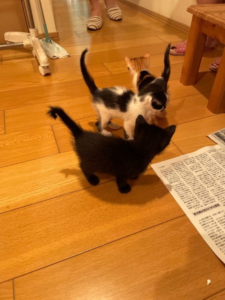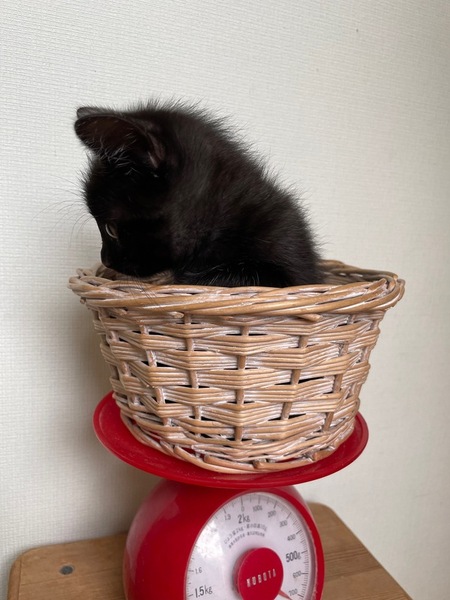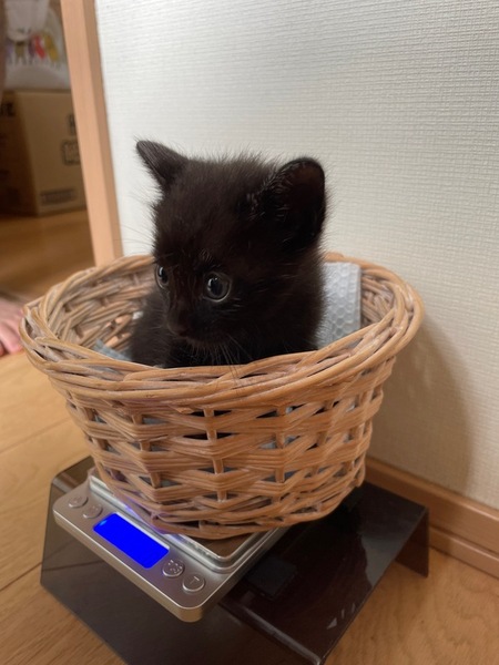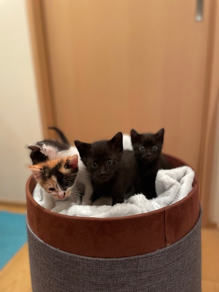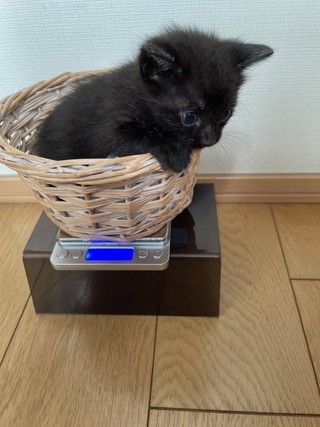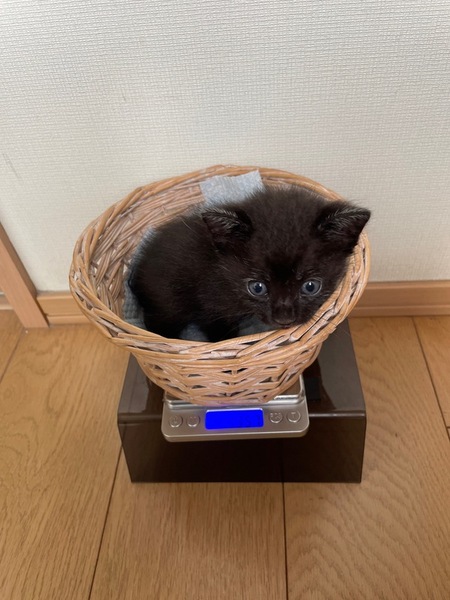 | 特徴(性格など) | 9/7に母猫と一緒に子猫4兄妹を保護しました 猫風邪もひいておらず、食欲もあり元気いっぱいです 9/1生まれの生後約1.5ヶ月、体重は約650g、クロの女の子で尻尾の先が少し曲がっています 乳歯が生えてきてウェットフードが美味しいのかモリモリ食べています ドライフードも頑張ってかじりながら挑戦しているところが可愛いんです 元気いっぱいでぴょんぴょん走り回って何にでも興味を示しています 自分でトイレへ行ってちゃんとするようになり、粗相はありません ・ブロードライン済(9/7) ・予防接種(10/29予定) ・ウィルス検査(10/29予定) 母猫はエイズ白血病どちらも陰性です |
