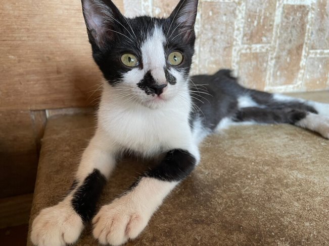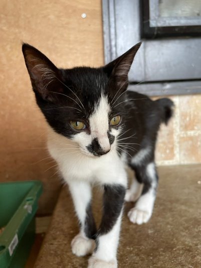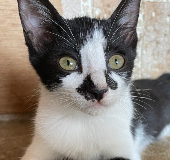 | 特徴(性格など) | 尻尾が90度に曲がった白黒猫で、口の横にほくろがあります。 | ||