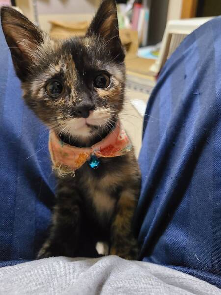 | 里親募集する理由 | 夏の暑い日に道に居ました、お母さん猫が戻って来る事もなく猛暑だったので心配になったか方が保護しましたが飼う事な出来ないからとこちらに相談にこられました。 預かりボランティアさん宅でスクスク育ってます。 |