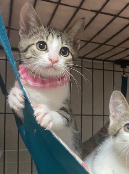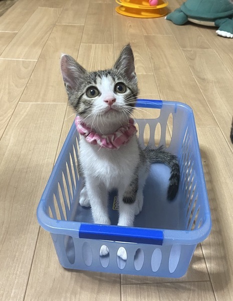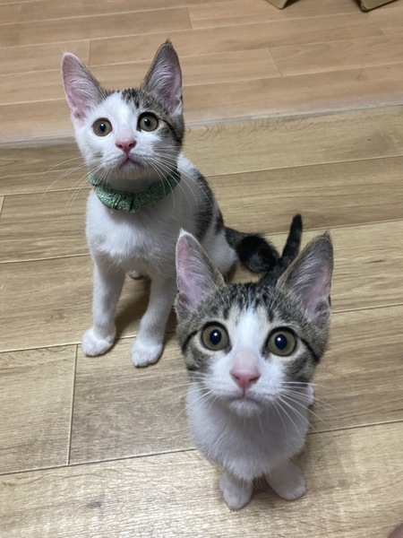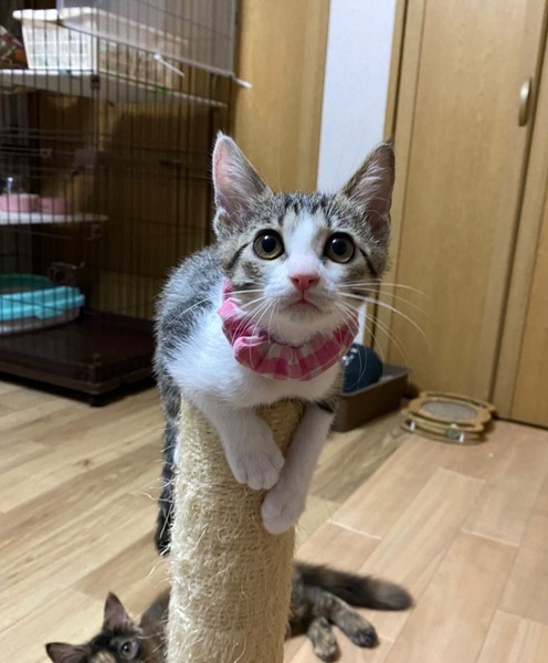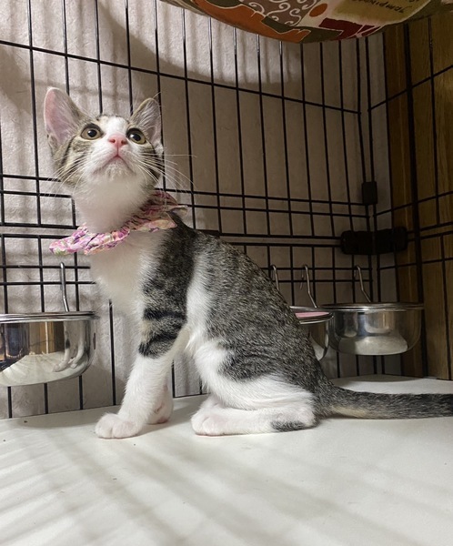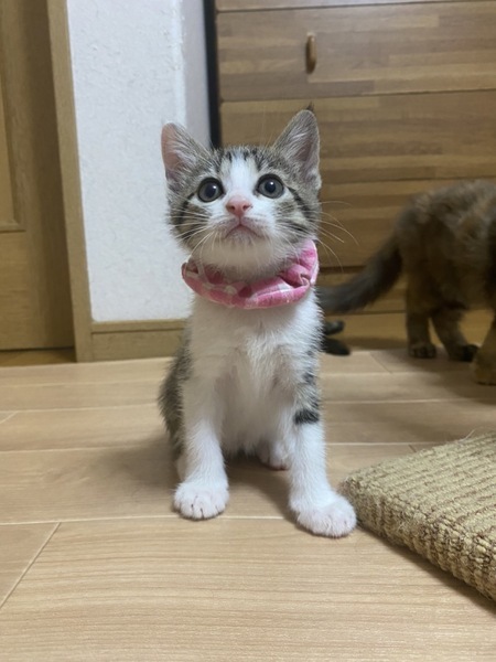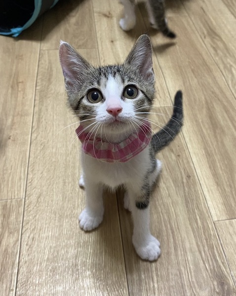| 特徴(性格など) | 2022.7.2生まれ 毛色:キジ白 キャシャな体で男の子達とのにゃんプロにも果敢に挑むヤンチャっ子♪ とても、人懐っこく人の足元でぴょんぴょん跳ねて 『わたちはここよ〜』と、挨拶してくれます。 好奇心旺盛なおしゃまな女の子!! 兄妹とも、他の預かりの子達とも仲良く遊べます。 クリクリお目目の可愛い女の子といっぱい遊んでください。 |
