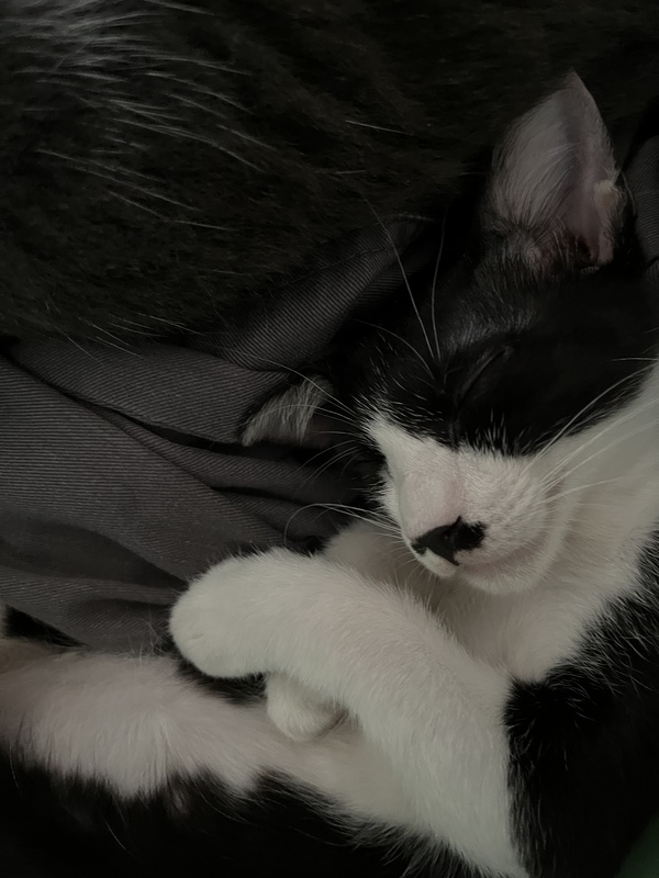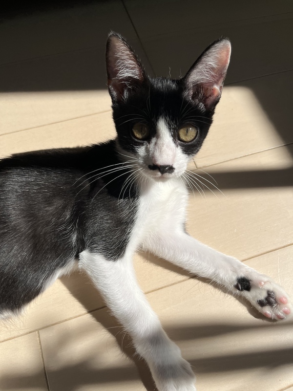 | 特徴(性格など) | 黒白ハチワレ とても懐こく、食いしん坊! ゴロゴロ甘えん坊です。 |