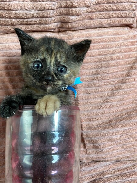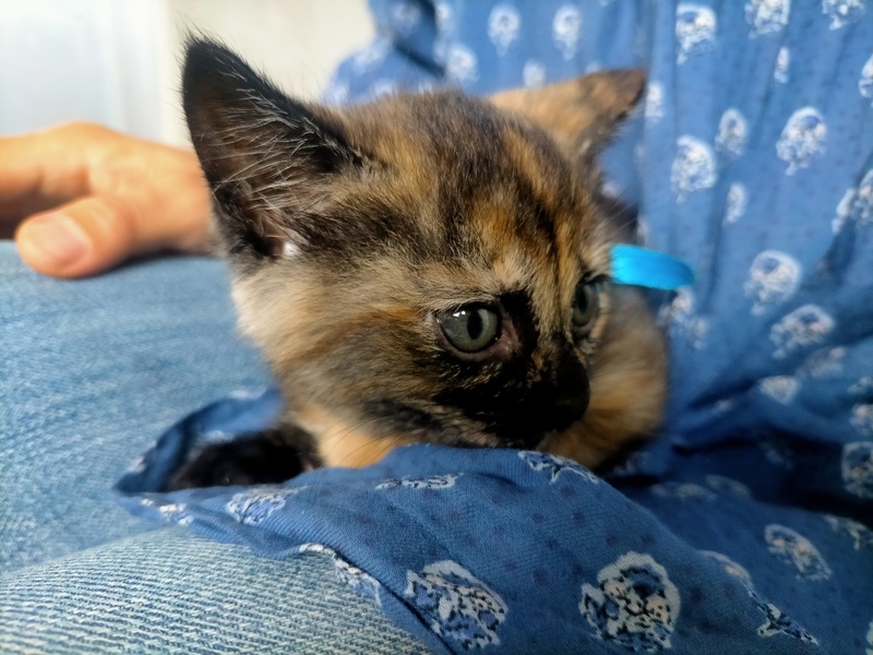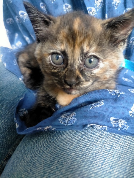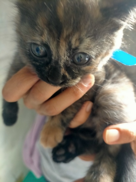 | 特徴(性格など) | サビ柄のメスの子猫です。犬かタヌキのような顔がチャーミング。おとなしく引っ込み思案ですが、初めての人の膝にも(乗せれば)そのまま乗っています。 | ||