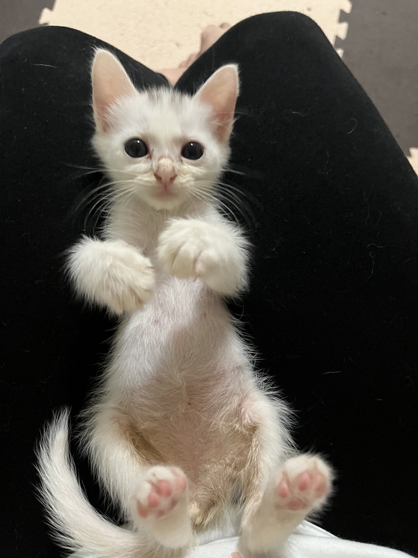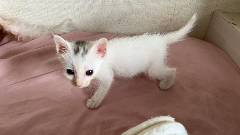 | 特徴(性格など) | 真っ白な体に頭に黒の模様の白猫ちゃん。 とても人間が大好きで、小さな体でトコトコと私の後を着いてきます♡ 元気ですが、穏やかなところもあります。 |