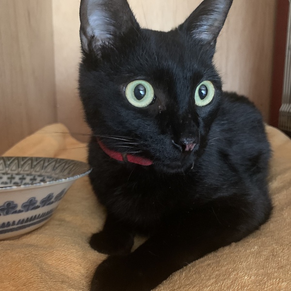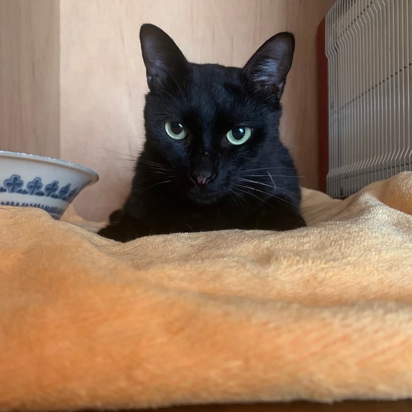 | 特徴(性格など) | 黒猫です。目と耳が大きくて可愛らしい子です。性格は少し臆病ですが、優しく穏やかな子です。犬も怖がらず、一緒に暮らしています。 | ||