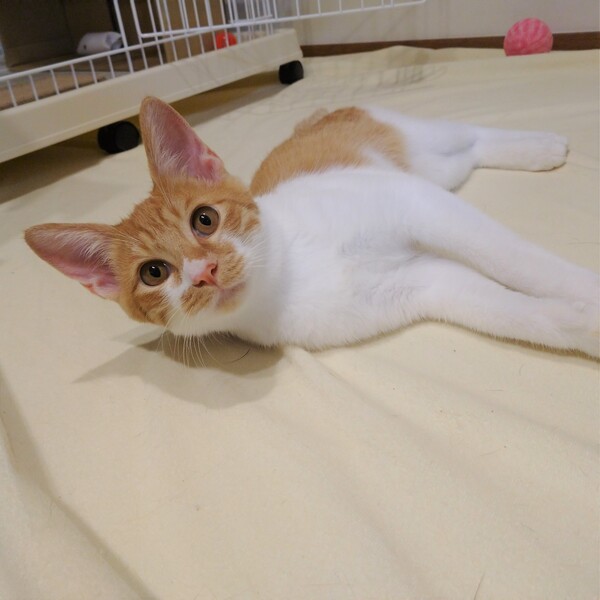 | 特徴(性格など) | 人に撫でられるのが大好き。人がそばにいるだけでゴロゴロと喉を鳴らす。 むぎゅ~っと抱きしめても、されるがまま。 元気いっぱい、遊ぶのも大好き。 高い所に飛び乗ったり、飛び越えたり、家中走り回ったりととても活発。 健康状態は良好、駆虫済み。エイズ、白血病、ともに陰性。 |