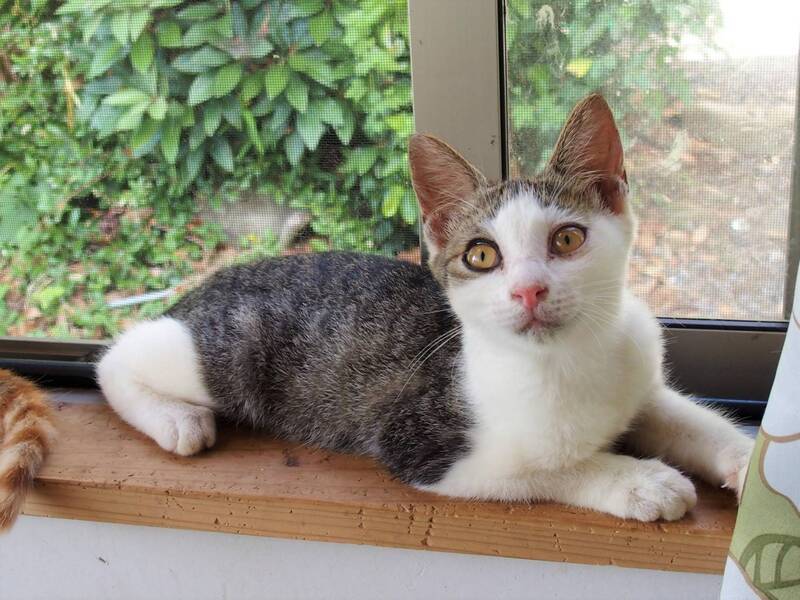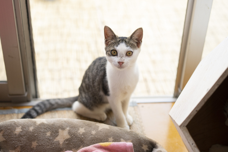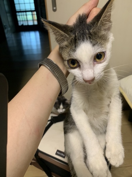 | 特徴(性格など) | 人懐こく愛らしい猫です。 片目だけ黒くふちどりアイライン模様です。 気付くといつもそばにいます。 後ろをついて歩いてきます。 静かにスリスリとアピールしてきます。 風邪の投薬をしていた為、抱っこは少しだけ苦手ですが、元々は抱っこも好きだったので、すぐ慣れるかと思います。 |
