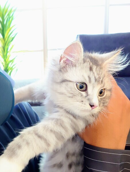 | 特徴(性格など) | 今の里親さんのご家庭で猫アレルギーの方が家を出られて、このままマルクを飼ってくださることになりました。 まだ細部を詰めておらず、最終確定ではないので、とりあえず里親さん募集停止に変更します。 ミヌエット、サイベリアン、ラグドールのミックス坊や、マルク。 里親さん再募集となりました。「いつでも里親募集中」で決まった里親さんに譲渡され、とても可愛がっていただきました。1匹だとマルクが寂しがるので、もう1匹(次に掲載予定の同胎のシルバータビー銀河君)またこちらから譲渡するというお話になっていました。ですが、非常に残念ながら、里親さんのご家族が猫アレルギーであることが判明して帰ってくることになりました。 マルクはやんちゃで人懐こくて、とても可愛いシルバータビー坊やです。 写真:1枚目から6枚目がマルク。7枚目がパパ猫の長足ミヌエット。8枚目がママ猫(ラグドールとサイベリアンのミックスで、ラグドール風の容姿)。 長毛・長足のミヌエット父猫と長毛ミックスのママ猫から生まれた長毛・長足のシルバーポイント・バイカラーのミックス坊やです。 ミヌエットの父猫:毛色はホワイトとクリームのモヘアのような超長毛。瞳は黄色。 ラグドール風のミックス母猫:青い瞳のブルーポイントバイカラー。このミックスの母猫は、ラグドールの父猫(青い瞳のブルーポイントバイカラー)とサイベリアン・ネヴァ・マスカレードの母猫(青い瞳のブルーポイントバイカラー)から生まれました。 マルクの毛色は銀と白で、銀色の部分は毛先が銀、根元が白。毛は根元から伸びるので、成長するにつれ、全体的に毛が白っぽくなります。同胎の中で一番小さかった一番やんちゃな男の子。瞳の色は黄色か黄緑(変化する可能性があります) 顔は八割れ。 鼻筋は全体的に白ですが、鼻先に小さな黒いチャームポイントがあります。手足の先も白。 かっこよく言えば、シルバーポイント・バイカラー・リンクス(シルバータビー)。 (=全体的に銀色で、鼻筋や手先に白のポイントカラーが入っている八割れの縞々猫) 可愛い男の子。 パパ猫ミヌエットがモヘアのような毛(参考:7枚目の写真)ですが、マルクは長毛でも、今のところ毛がそれほど長くないので、もつれていません。 モヘアの毛は繊細で美しいですが、もつれやすいので、もつれる前に頻繁にブラッシングしてやってください。ただし、マルク君の毛は、ビロードかベルベッドのように質感が変化する可能性があります。 いずれにせよ、一旦毛がもつれたら、ブラッシングを痛がってブラッシングを嫌がるようになります。ブラッシングできなくなって更にもつれてフェルトのように固くなると、ペット用バリカンでも刈れなくなります。この場合、麻酔をかけてハサミでカットすることになりかねません。大人しい猫でも、ハサミでカットすると皮膚を切る可能性がかなり高くて、万が一首の頸動脈などを切ると死ぬからです。 マルクは同胎3匹の中で一番人懐こい子で、なでてもらったりマッサージしてもらうのが大好きな子です。 猫の多頭飼いで育ったので、猫とも仲がいいです。 多頭飼いでわいわい楽しく育っていますので、必ず猫2匹以上(5匹以下)で飼ってやってください。 ペットではなく家族として飼ってください。 特にサイベリアンは犬的な性格もあり、家族思いで、飼い主が冷たいと早死にするとも言われています。 サイベリアンの血が1/4のこの子でできるかどうかはわかりませんが、サイベリアンにボール遊びを教えれば、犬のようにボールを取って来るそうです。 |