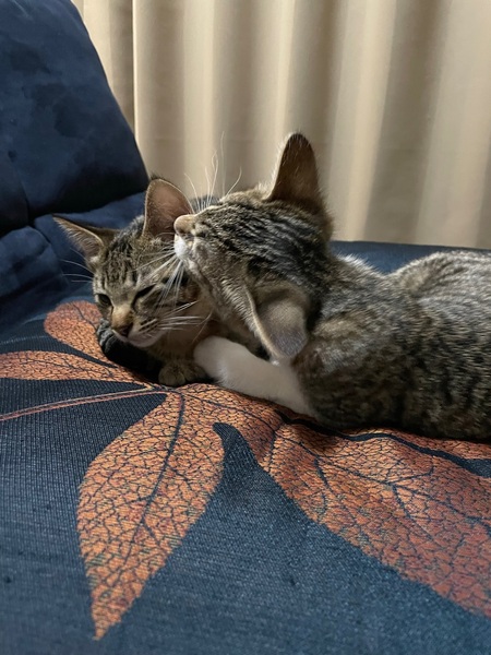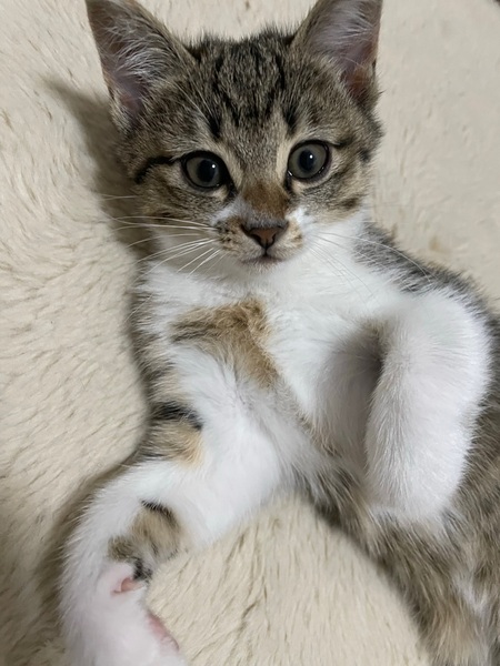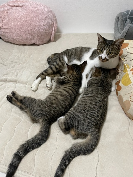 | 特徴(性格など) | つなで(女の子)キジシロ じらいや(男の子)キジトラ お母さんに似てとてもかわいい顔立ちです。 女の子はヤンチャで先住猫に果敢に挑んでいます。 男の子は最近慎重ですが、慣れると女の子と共に走り回ってます。 二匹とも人慣れ問題なし、食欲旺盛です。 お母さんの血液検査済み(エイズ、白血病共に陰性) ふとした時に膝に乗ってくれるので、お母さんがいても人間に甘えてくれます。 |