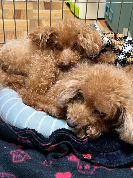 | 特徴(性格など) | 【2匹一緒でお願いします!】 ルイ:2.52キログラム。 ココ:3.28キログラム。 トイプードルの兄弟です。 いつでも一緒の仲良しさんです♡ 2匹一緒に家族として迎え入れてくださる方でお願いします。 保護されたばかりで環境に慣れてないせいか、1匹になるとすごく不安そうにもう1匹を探します。 2匹一緒だととても安心するようで寄り添って寝たり、ちょこちょこ楽しそうに歩き回っています。 2匹とも大人しく穏やかな性格です。噛んだり威嚇したりすることはありません。他のワンちゃんとも仲良くできます。 高齢のため後ろ脚が曲がって(腰が落ちている?)いますが、血液検査やレントゲンの結果、内臓などには異常ありません。 ずっと2匹一緒に仲良く育ってきましたので、高齢になって離れ離れはかわいそうです。これからも2匹一緒に安心して過ごせるよう、優しい里親さんをお待ちしています。 どうか、ルイくんココくんが安心して暮らせるよう宜しくお願い致します。 ※遠方でも応募可能ですが、必ず一度は会いに来て頂くようお願いします。対面でのお見合い必須です!! ●単身者可能 ●シニア世代可能 |