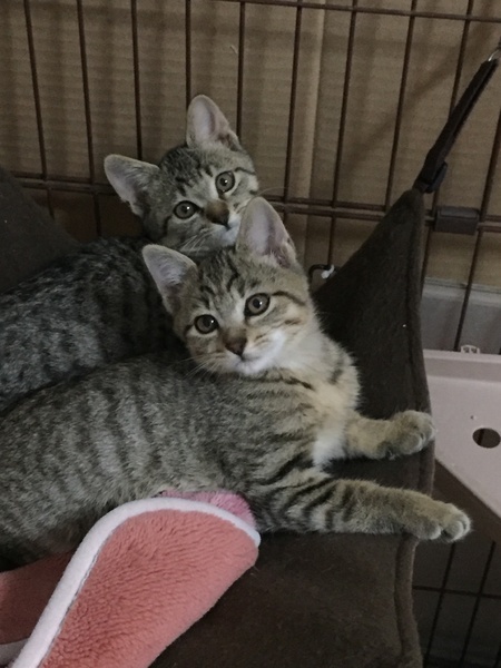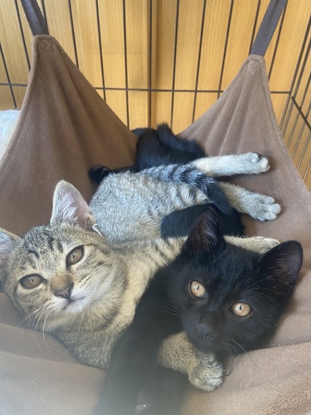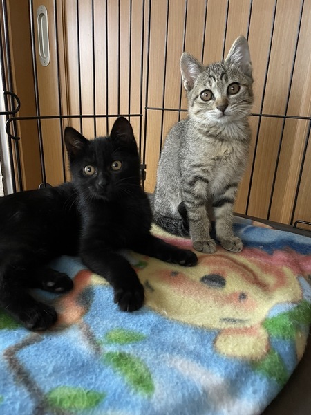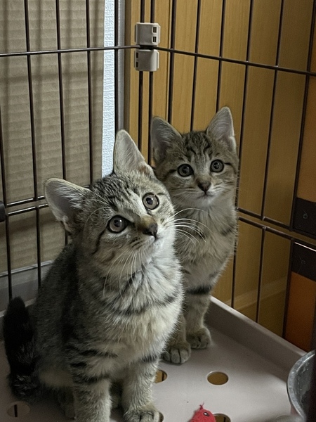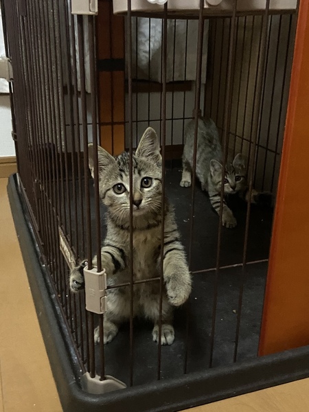 | 特徴(性格など) | キジ模様の3匹は女の子です。 3匹ともお転婆さんです。黒は男の子でこちらも腕白さんです。4匹とも保護されてから日が浅いので人馴れの途中ですが、随分なれケージの中ではすりごろさんです。 もう少し人好きまでには時間がかかるかもしれませんがなれる子達だと思います ゆっくりこの子達のペースに向き合って頂けたらと思います。 兄妹2匹での譲渡になります |