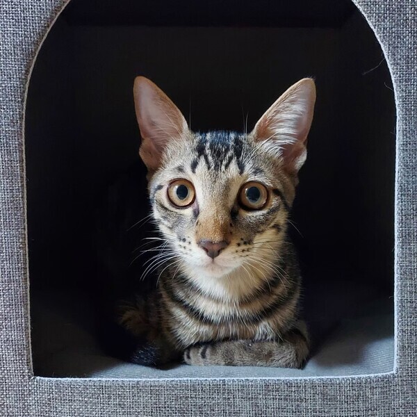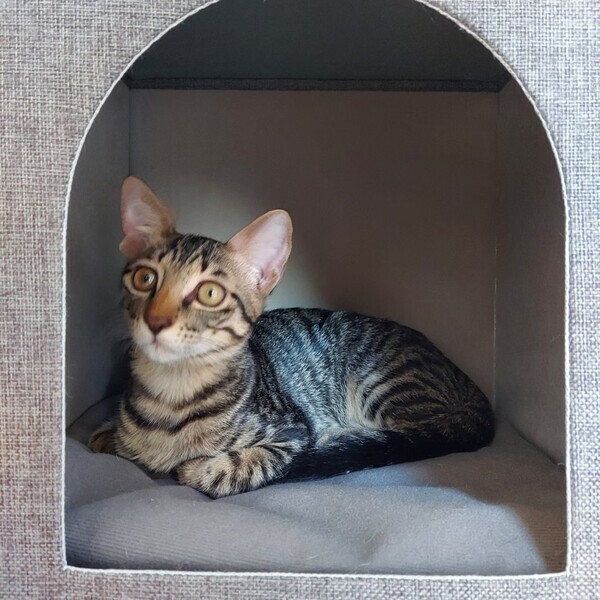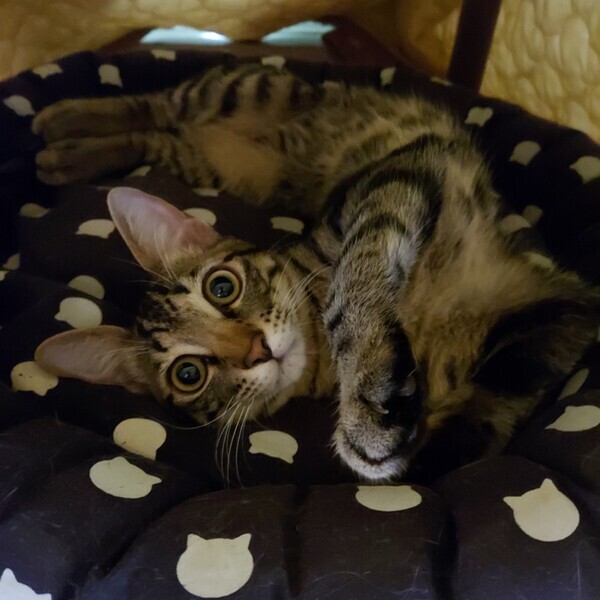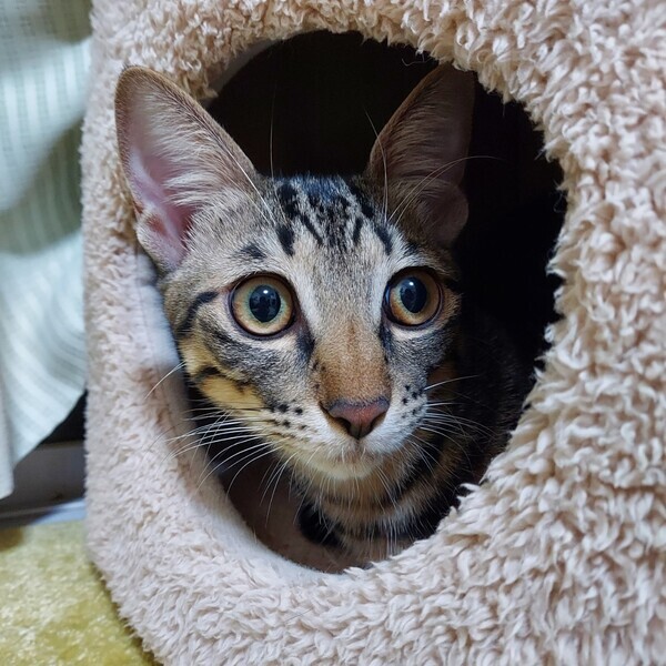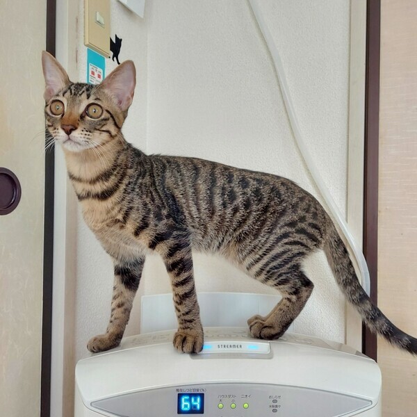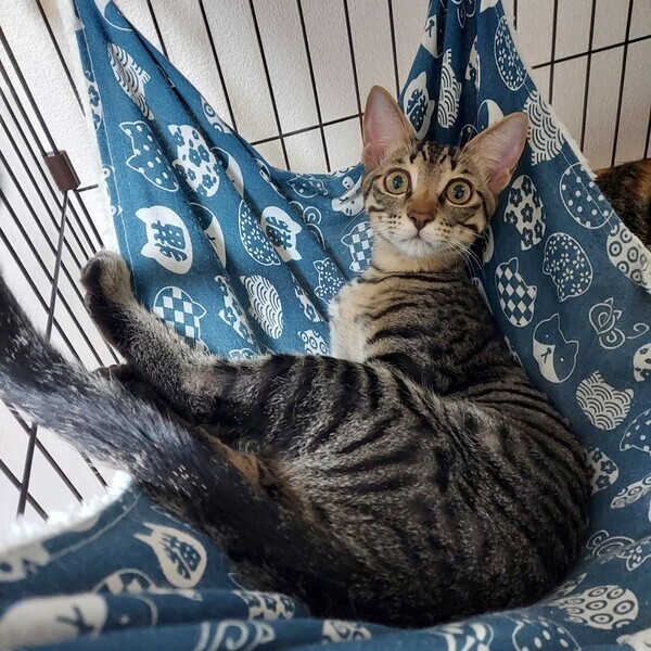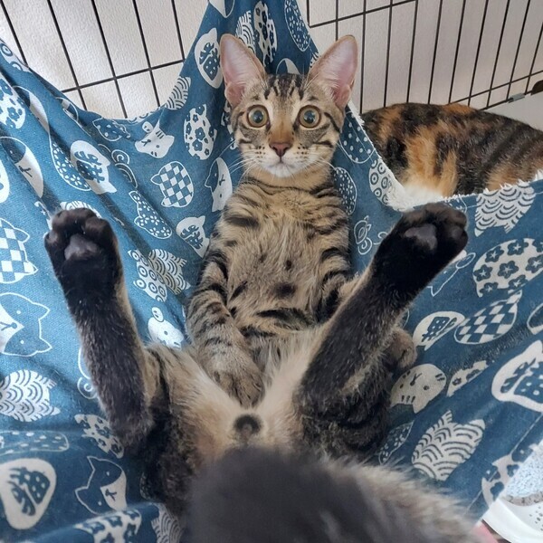 | 特徴(性格など) | 【性格】 しっぽ、手足の長いキジトラ猫。細身マッチョタイプ(4.5kg 2023/3月時点) 少したれ目のくりくりお目愛でイケメンくん 好奇心旺盛、食欲旺盛の元気いっぱいの男の子です。 おもちゃで遊ぶの大好き。おもちゃの引出しを開けると飛んでやってきます。 人の膝に乗ってゴロゴロ甘えてくるとても可愛い子です。人のそばに居るのが好きなようで、よくへそ天で可愛い寝姿を見せてくれます。 一緒に保護された子猫(みーこ/三毛猫)ととても仲良しで、ごはん・トイレ・昼寝・遊びいつも一緒です。 【しつけ】 トイレ・ケージしつけ済 トイレ:普通のトイレに慣れています(紙砂・ベントナイト砂) ケージ:食事時、使用しています まだまだやんちゃでいたずら盛りなので、ケージをご準備くださると安心です。 【健康状態】良好 ☆去勢手術済 ☆ワクチン(2回)済 ☆エイズ/白血病(陰性) ☆血液検査済 ☆便検査クリア ☆ノミダニ駆虫済 ☆シャンプー済 ☆マイクロチップ登録済 |