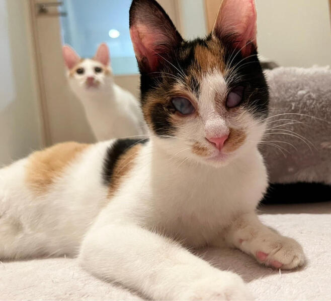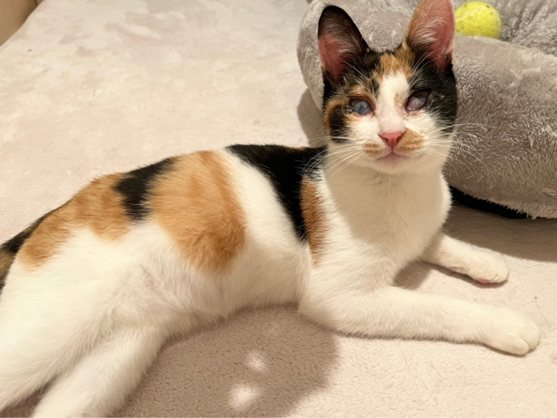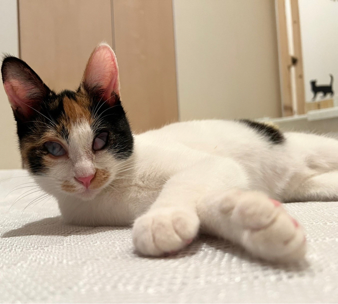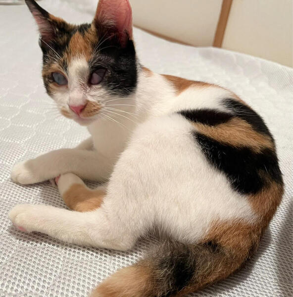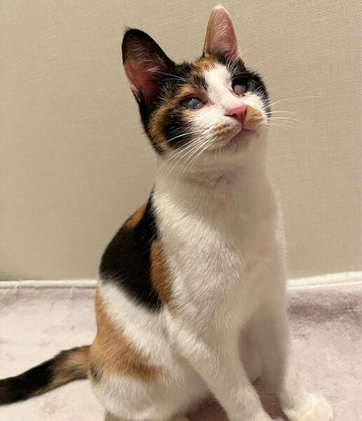| 特徴(性格など) | 目に白濁が残り視力はあまり良くありませんが、両目とも見えてます。 性格が物凄くかわいい子で人馴れ抜群なので、目の事をご理解くださる方でしたら猫飼い初心者のお方にもオススメできます! アタチには名前がなかったので、熊本市のセンターで『みくに』という仮名をもらったわ。 幸せになれると信じて、お空を飛んで東京にやってきたわ! ーーーーーーーーーーーーーーー 【性格】人も猫も大好きなとても愛想の良いかわいい三毛猫みくにちゃんのご紹介です。 画像の通り、みくにちゃんの目には白濁と瞬膜が残っています。 これは、多頭崩壊による猫風邪の蔓延で、飼育放棄されていた為にこのような目になってしまいました。 実は、みくにちゃんは訳あって熊本市からお空を飛んで(飛行機にて空輸)やって来ました。 その理由は、熊本市のセンターにて殺処分対象となっていたからです。 こんなかわいい子達の命を奪ってはならない!とそう思い、当会(NPO法人府中猫の会)で、26匹の猫達を空輸し、東京に連れて来ました。 その様子を宜しければYouTubeにアップしておりますのでご覧くだされば幸いです。 https://youtu.be/Qb7i0xsWO2o みくにちゃんを連れて来て、直ぐに治療にとりかかりました。眼科のプロの先生の所で、やれる限りの積極的治療を致しました。 角膜剥離手術の後、コンタクトレンズを使用して、角膜を綺麗にする治療をし、みくにちゃんの目の視力をアップさせました。 治療の甲斐があって、熊本から連れてきた当初より視力はアップ致しました。 これ以上悪くも良くもならないと先生からです。 あとは、目ヤニが出たら、たまに拭いてあげてください。念のための目薬も渡せます。 こんなにかわいい子はいないのではないか?というぐらいかわいい子でして、預かりをメロメロにさせてくれました。 代表宅時代のみくにちゃんの様子はこちらをご覧ください。 https://youtu.be/k5P2Y-rTkB0 人慣れ抜群、どんな猫とも上手くやっていける魔性の女の子です(笑) 目が悪い分、器量よしのかわいい子なので、自信を持ってオススメさせていただきます。 注意点としては、高い所に登る事が出来ても、下に下りる事ができないので、その辺を考慮してくだされば、あとは他の猫達となんら変わりありません。 詳しくは、譲渡会のスタッフまでお問い合わせください。 お留守番もできます。 猫の社会化は抜群に長けているので、先住猫さんさえOKならば問題なく迎えていただけます。 詳しくは譲渡会スタッフまでお問合せください。 かわいいかわいいみくにちゃん 目にハンデがある事も全て受け止めてくださる素敵な出会いがあると信じて、譲渡会に参加致しますので、どうぞよろしくお願いします。 |