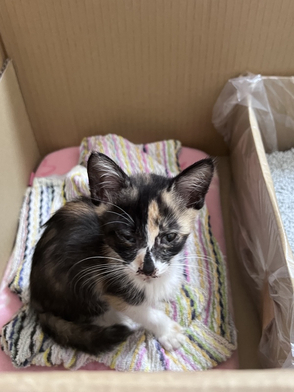 | 特徴(性格など) | 黒多めの三毛猫の女の子です。 性格は人懐っこいようで、人の膝に座りにきます。 |