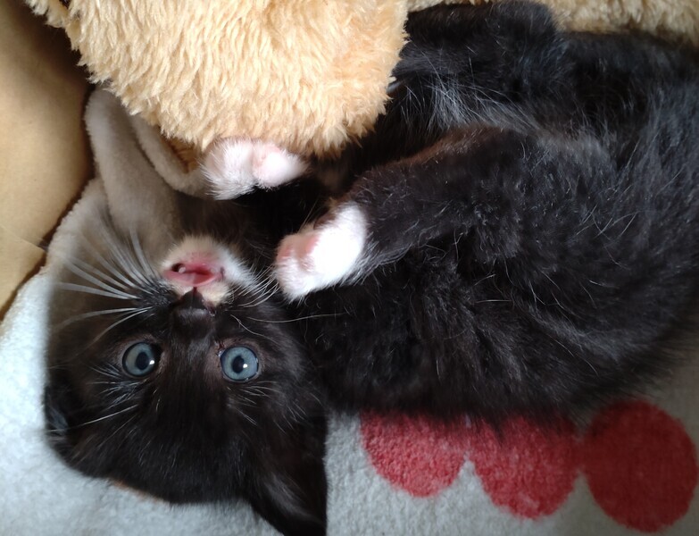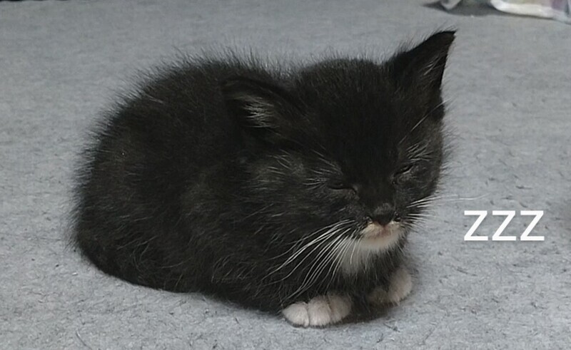 | 特徴(性格など) | パッと見黒い子に見えますがうっすらトラ柄が入ってます。 足先が靴下みたいで可愛いです♡ 段々慣れてきて、よく遊んでよく食べてよく寝てます^^ 性別が、見分け方がよくわからず、不明です⤵ |