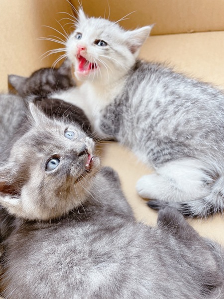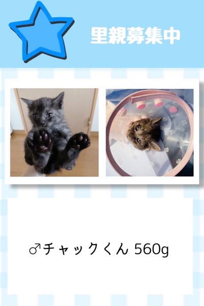 | 里親募集する理由 | 会社の近く居たのですが環境が悪かった為、保護しました。 4匹兄妹でとても仲良いので出来れば兄妹で飼ってくださる方を探しています。 |