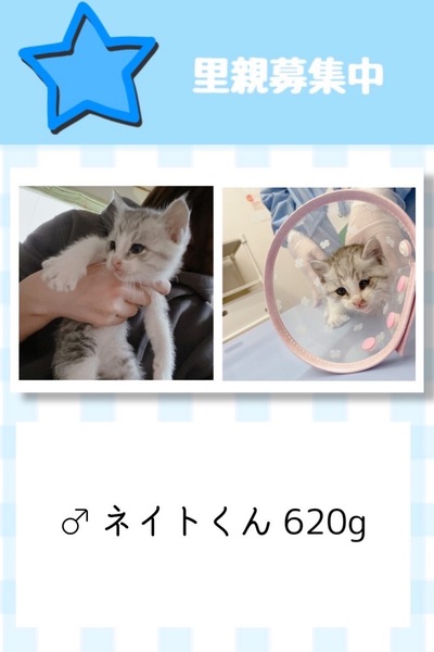 | 里親募集する理由 | 会社の近く居たのですが環境が悪かった為、保護しました。 4匹兄妹でとても仲良いので出来れば兄妹で飼ってくださる方を探しています。 |