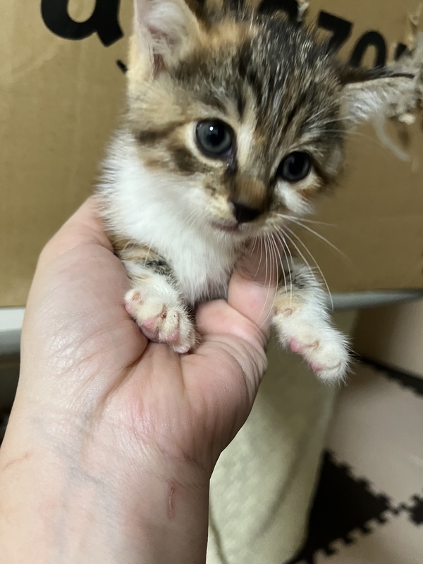 | 特徴(性格など) | キジトラ柄の三毛猫ちゃん 顔は赤ちゃんですが、体は少し大きめ。 手足が短く、胴が太くてすっごくかわいいです! 人間にも犬にも猫にも威嚇せず、仲良く出来る性格の良い子です。 |