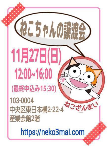 | その他(譲渡条件など) | 11:30より、2階会場入口にて受付を開始します。 受付時に入場予定時間が記入された整理券をお配り致しますので、整理券を受け取った方はお時間になりましたら2階会場入口に番号順にお並び下さい。 ※11:30より早くいらしてもお待ちいただく場所がございません。 また、近隣にお住まいの方や他階フロアのご利用者様にご迷惑となる場合がございますので、受付開始時間にあわせてお越しくださいますよう、何卒ご協力お願いいたします。 ※ねこざんまい譲渡会は、先着順で里親様を決定する譲渡会ではありません。 先に申し込みをした方を優先することもありません。 お話をして、その猫ちゃんに合ったおうちに決めさせていただいております。 12時に開場し、里親様の決定は14時以降となります。 14時以降にご入場の場合、希望の猫ちゃんが決定している可能性があります。 また1頭に対し多数のご希望をいただいた場合、早めに申し込みを締め切らせていただく場合がございますので、予めご了承下さい。 里親様決定は14時以降となります。 その後、迎え入れ準備の説明等のお時間も頂戴しますので、お時間に余裕を持ってご来場下さい。 【新型コロナウィルス感染予防対策について】 譲渡会開催に際し、ご来場下さいます皆様には以下の内容をご理解頂き、ご協力頂けます様お願い申し上げます。 ●入場前の検温とアルコール消毒の実施 ●マスク着用でのご入場=マスク未着用でのご入場はお断り致します ●入場人数の制限をさせていただきます(来場多数の場合は入れ替え制となります) ●時間と人数の制限=密になる事を防ぐ為に入場人数とお時間の制限を設けさせて頂きます その為お待たせしてしまう場合もございます ●会場利用規約により、ご来場者様の連絡先を控えさせていただきます あらかじめご了承下さい。 諸々の制限がございますが、安心・安全な譲渡会運営のためにご理解・ご協力いただきますようお願い申し上げます。 ~~~~~~~~~~~~~~~~~~~~~~~~~~~~~~ ★仔猫ご希望の里親様★ 仔猫ちゃんたちは、まだ体がしっかりしていない赤ちゃんです。 下痢だけでも数時間対応ができなかっただけ死に至る事もあります。 その為、月齢に応じたお留守番時間を設けさせていただいております。 また、子猫ちゃん(6ヶ月未満)の里親様には子猫支援金のご協力をお願い致しております。 ★猫ちゃんとのお見合いは譲渡会で!★ ねこざんまいの猫ちゃんは譲渡会でのお見合いのみとなります。 『この子はいつ譲渡会に参加するの?』『譲渡会場の場所はどこ?』などは、ねこざんまいホームページをご覧ください。 https://neko3mai.com/ ★楽しく猫ちゃんと触れ合って★ ねこざんまい譲渡会は、猫ちゃんも里親様も保護主も笑顔で過ごせる譲渡会を目指しています。 これから20年以上、楽しい時も、悲しい時もいつも傍にいてくれる大切な家族になる猫ちゃんです。 会場には沢山の猫ちゃんがいます。 1匹1匹、触れ合って猫ちゃんとお話してください。 『初めて猫ちゃんを家族に迎える方』 『先住猫ちゃんのお友達を迎える方』など トライアルの仕方や先住猫ちゃんと仲良くなるコツなど経験豊富な保護主やスタッフにお気軽にご相談ください! 猫を愛し、そして猫に愛されている猫好きスタッフと保護主がアドバイスさせていただきます。 ★里親希望のみなさまへ★ ペットではなく、家族一員としてたっぷり愛情を注いでくださるご家庭をお待ちしております。 恐れ入りますが ●学生の方 子猫・幼猫希望の60才以上の方のみのご家庭 ●脱走防止対策にご協力いただけない方 は原則譲渡を遠慮させていただいております。 ●一人暮らし・同棲(事実婚)の方 保護主の希望や猫の年齢・性格等により、ご希望に添えない場合もございます。 参加猫ちゃんは、それぞれ保護主(実際に猫ちゃんを自宅に入れ、保護をしている方)が異なります。 詳しい条件なども異なる場合がございますので、会場内で直接保護主とお話ください。 〖共通条件〗 1.終生飼育 2.完全室内飼い 3.脱走防止対策へのご協力 4.避妊去勢手術 5.契約書類へのサイン 6.定期報告 7.医療費等の負担 当日の猫ちゃんを連れて帰ることはできません。後日、保護主が里親様のご自宅までお届け致します。 その為、移動の際の猫ちゃんの負担を月齢などから考慮し、お届け地区を限定させて頂くこともございますのでご了承ください。 ご理解とご協力のほど宜しくお願い致します。 ☆よくある質問☆ ・譲渡の条件 ・ご負担頂く費用 ・譲渡会の場所等は ホームページに詳しく掲載させて頂いておりますのでご覧ください。 https://neko3mai.com/ メールでのお問い合わせはすぐにご返答出来ない場合がございますのでご了承ください。 ホームページ https://neko3mai.com/ お問い合わせ http://www.neko3mai.com/contact/form_general.html ねこざんまいブログ http://ameblo.jp/neko3mai/ |