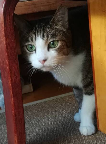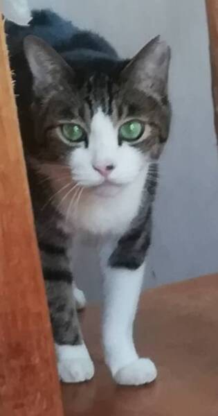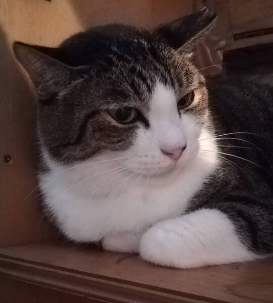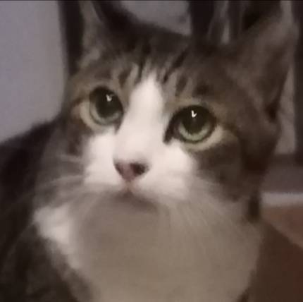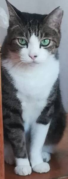 | 特徴(性格など) | 綺麗な顔立ちのイケメンキジトラ白です。目はブルー。カギしっぽ。頭がよく性格は穏やかですが、イザとなると喧嘩には強いのです。魅力的な猫です。 歩き方はおっとりして、動作も鈍いです。 優しく、甘ったれでナデナデが大好きです。良くお話します。(アーウ、アグー、アヴォヴォワ) お留守番してね、行ってきます等話しかけるとアンと返事をしてくれます。 慣れるまでは怒ったり、怖がったりしますが爪を立てたり嚙んだりしたことは有りません。 |