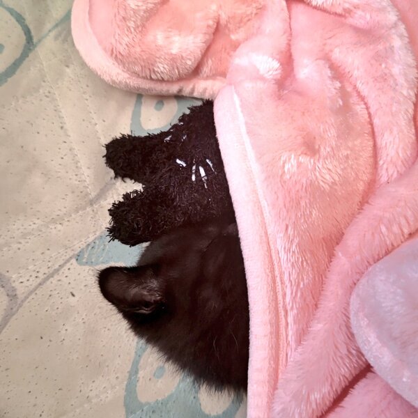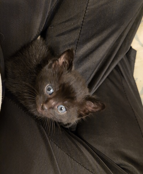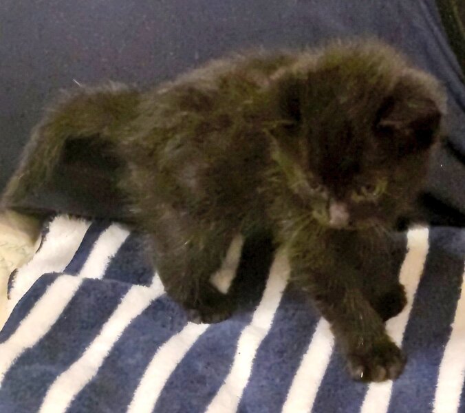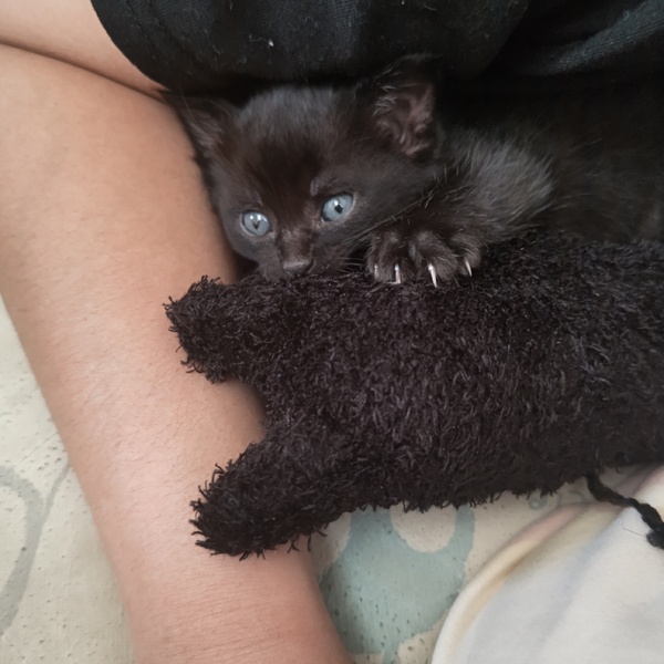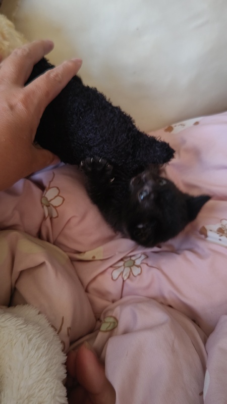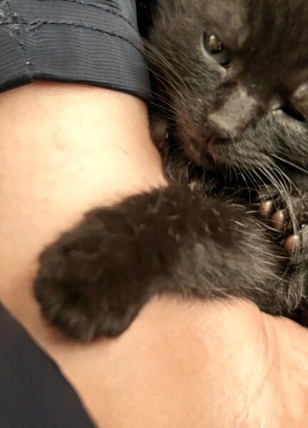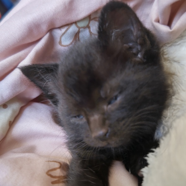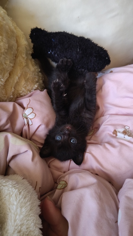 | 特徴(性格など) | 黒猫でかぎしっぽです。 よく食べ、よく遊び、よく寝る甘えん坊な男の子です。膝の上が好きなようで、よく膝に乗って寝ています。 とても小さな子猫ですが、子猫用のパウチ、子猫用のミルクを現在与えています。 |