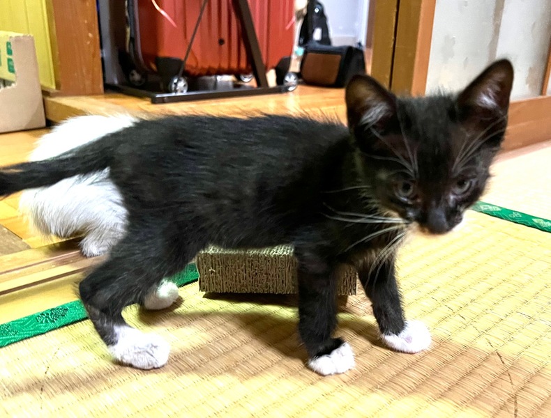 | 特徴(性格など) | おそらくオスだと思います。 黒猫・手足だけ白いので足袋を履いているようです! 可愛い顔をしています。 性格はヤンチャで一人遊びをしたり、他の猫たちにちょっかいをかけて遊んでいます。 とっても元気で私が立っているとズボンをつたって登ってきたり、肩の上まで登ってきたりもします。 初めは警戒心が強く感じましたが、慣れてくると自分から人に寄っていく様子が見られました。 |