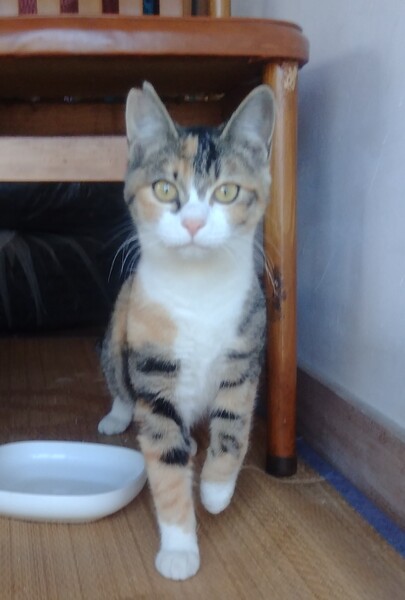 | 特徴(性格など) | とっても可愛いメスの三毛猫ちゃんです。 保護猫なのでまだ人を怖がりますが、よく食べて元気いっぱい家の中を探検しています。 |