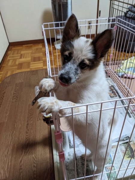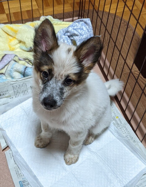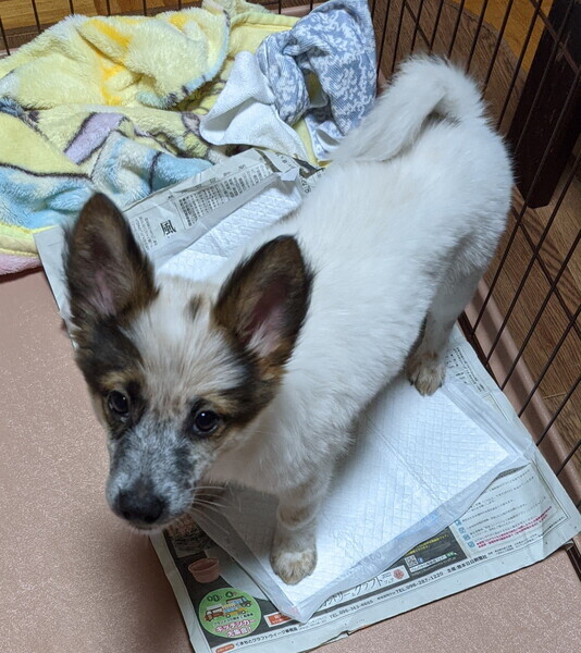 | 特徴(性格など) | 毛色:全体白に斑 将来は中型(11~14キロ)の大きさになると思われます。 人が好きで食欲旺盛な子です、ごはんの時には「オスワリ」できます。 ケージ内では寝床とシートの場所の分別ができ、シートの上に排せつしてくれます。 たまに掻いたりしていますが、成長とともに改善されると思います。 病院でも薬用シャンプーでのケアのみでいいということです。 |