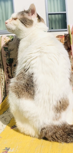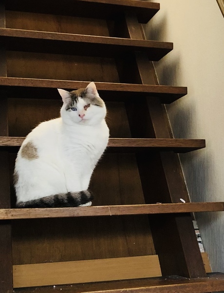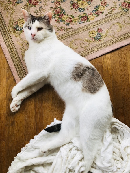 | 特徴(性格など) | 白に茶色の斑点の毛並みです。 人なつこくて、元気です。 ごはんの時は泣きます。 生まれつき片目がないですが、健康です。 |