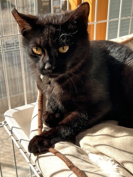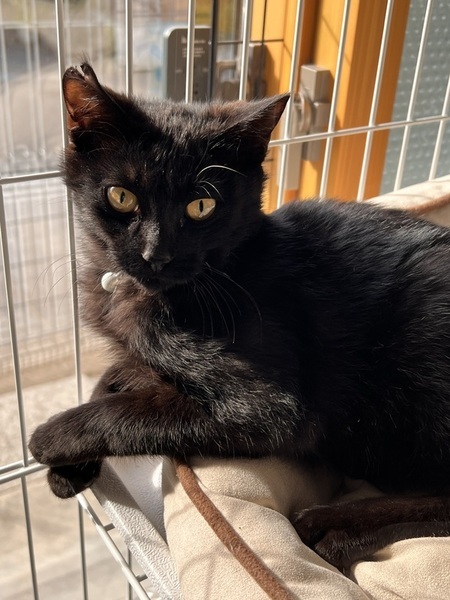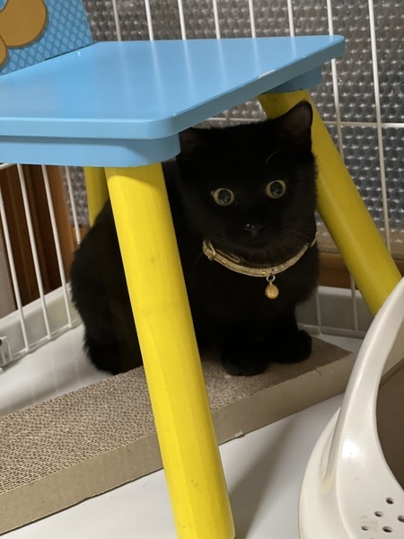 | 特徴(性格など) | 金目の真っ黒な黒猫さん。 シャイで臆病な怖がりさんです。人馴れ修行中 |