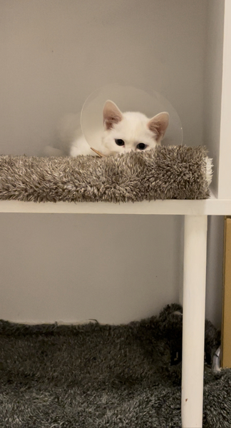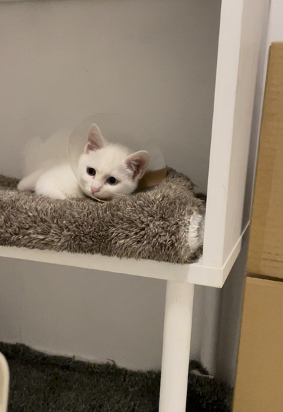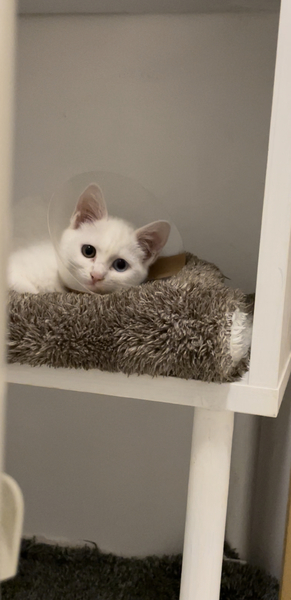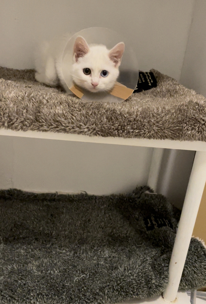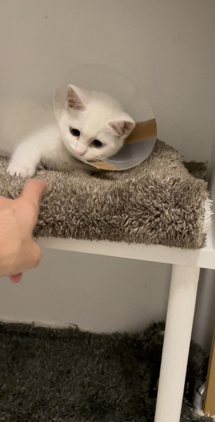| 特徴(性格など) | オッドアイです。 近くに寄るとまだ怖がりシャーシャーしますが触ると甘えます。 猫が好きな猫さんのようなので先住猫さんがいるお宅でも大概仲良くなると思います。 怪我しているのでまだカラーをつけています。 |