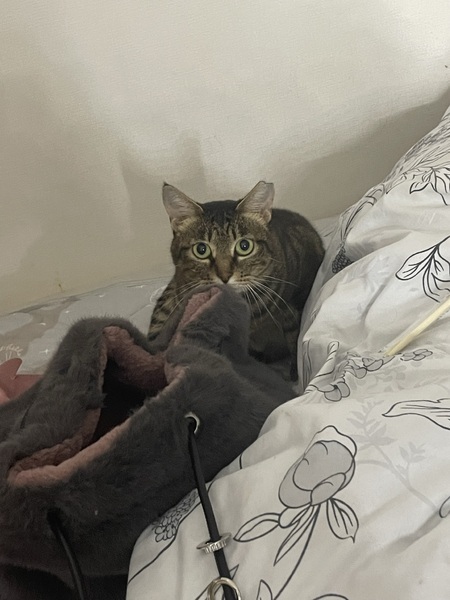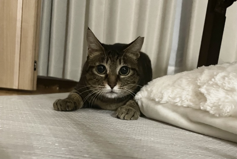 | 特徴(性格など) | キジトラの小柄な女の子です。叩いたり噛みついたりしないおとなしい子ですが遊ぶのが大好きで鳥の羽がついたおもちゃやウサギの毛がついたおもちゃを気に入っています。病院に連れていく際も同様におとなしいので、獣医さんや看護師さんにはよく褒められるいい子です。 | ||