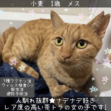 | 特徴(性格など) | ☆仮名:小麦 ☆性別:メス ☆年齢:1歳位 ☆体重:3.5kg ☆ブロードライン(フィラリア症予防、ノミ・マダニ対策、消化管内寄生虫駆除)10/29 ☆猫白血病ウイルス検査10/29:陰性 ☆猫免疫不全ウイルス検査10/29:陰性 ☆5種混合ワクチン10/29済み ☆不妊手術11/5済み ☆ちょっと珍しい茶トラのメスです ☆きれいな茶トラ模様、長くてまっすぐな尻尾 ☆人馴れ度マックスでナデナデが大好き! ☆野良生活を経験しているとは思えない角のない性格なので、環境が変わってもすぐに慣れると思います^ ^ ★母猫小麦ちゃん、子猫の柚子ちゃんと福くんの家族3匹の里親さんを募集しています。 ・全員が仲良し(みんなで猫鍋状態で寝ています) ・超フレンドリー&のどゴロゴロ ・抱っこOK ・性格が良い ★心も体も大きく成長する時期にたくさん接して遊んであげてほしいので、お留守番の短いおうちを希望します。 ★仲良し家族3匹です。2匹、3匹一緒に迎えくださるご縁があれば嬉しいですが、1匹ずつのご応募も歓迎します^ ^ ★ご応募の際は、別記その他をよくお読みになりご検討をお願いいたします。 |