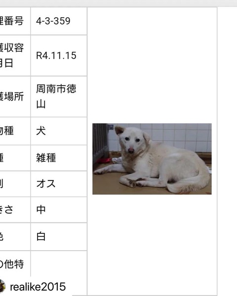 | 特徴(性格など) | 可愛い穏やかなお顔 唸りも威嚇もありません 人間が怖く怯えています 大きさは中型犬サイズとなります |