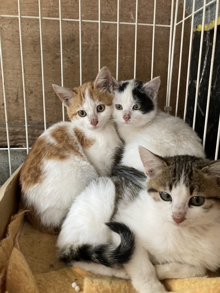 | 特徴(性格など) | 茶シロは男の子、キジ白、白黒は女の子 保護した時は怖がってシャーシャーでしたが慣れてきました 丸顔で可愛い子猫達です 先住猫さんがいらっしゃらない場合は兄弟一緒に迎えてくださる方を希望しています ノミダニ駆除済み エイズ白血病検査陰性 真菌治療中 |