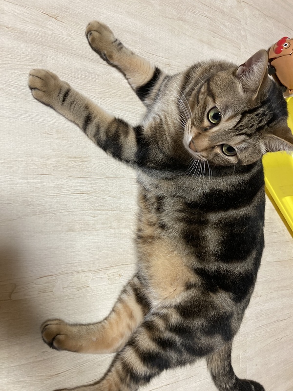 | 特徴(性格など) | お腹までしっかりと虎柄模様の猫です。 人懐っこい性格でよく抱っこを要求してきます? |