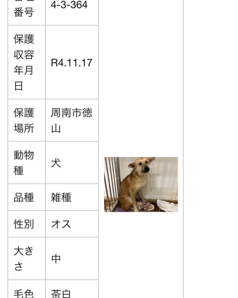 | その他(譲渡条件など) | ⚠️野犬ですのでマイナスからのスタートです 応募される前に必ずご家族の同意を確認されてからお願いいたします 《譲渡条件》 ◎単身者、高齢者の方は基本お断りしています (後見人がいる、飼育環境、状況により可能な場合もあります) ◎持ち家 ※マンションの場合10キロ以上(中型犬以上)、大きさや飼育可能頭数など大丈夫か飼育規約を必ず確認してください ◎完全室内飼育 ◎留守番時間の少ない家庭 ◎脱走対策(柵やゲート) ◎現地調査 詳しくはお問い合わせください ?安易に可哀想だからとあと先考えずその時の感情だけで引き取るのはやめてください 毎年の予防注射、フィラリア予防薬、マダニやノミ予防、ケガや病気をすれば医療にかけてあげる それなりの医療費もかかります 犬にとってお散歩は重要です お世話には時間もかかります 無理だからと途中で止めるような責任のない行為はやめてください‼️ 近年、犬の寿命も延びています 10数年先までの事をよく考えて決めてください 同じ大事な命だと言う事を忘れないでください ※直接来られる方は… 周南健康福祉センター 0834-33-6426 センターの譲渡条件に従っていただきます。 平日にお迎えができる方は、直接、センターにお問合せをしていただきお迎えも可能です。 センターは平日の8:30〜17:15までです。 (⚠️土日祝日は休み) 身分証明書と犬を入れるキャリーケースをご用意ください また、センターのHPを見られて直接お迎えに行かれる方もいらっしゃいます その場合、直接センターに行かれる方が優先となりますので、ご了承いただければと思います。 |